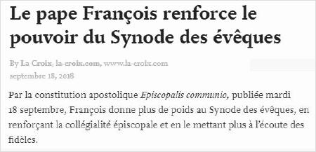 Cette longue introduction nous amène à parler de la Constitution apostolique Episcopalis communio sur le Synode des Évêques, publiée le 15 septembre et présentée hier à la presse. À part la forme du document ("constitution apostolique"), qui me fait immédiatement penser aux pressions exercées sur le Pape, il y a un an, par quelques membres de l'épiscopat allemand, pour que les réformes soient "gravées dans la pierre" au moyen, précisément, d'une constitution apostolique (cf. querculanus.blogspot.com), je n'ai pas envie d'exprimer une opinion sur son contenu. Je l'ai lue; je n'y trouve rien de révolutionnaire; pour donner une évaluation, il faudrait avoir une expérience directe, ce que je n'ai évidemment pas. Ma seule préoccupation est que les paroles soient suivies d'actes. Pour ne donner qu'un exemple, si l'on parle d'"écoute du Peuple de Dieu" (n. 6), il faut espérer qu'une telle écoute aura réellement lieu. La crainte est qu'en fait, elle se réduise à écouter toujours les mêmes, confondus avec le "peuple de Dieu". On parle de "consultation des fidèles": parfait! La crainte est que cela aboutisse à la consultation des instances habituelles de participation, constituées par les différentes 'élites' au niveau paroissial, diocésain, national, etc.