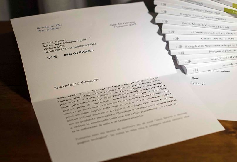 Dans la lettre datée du 9 février et écrite en réponse à une demande de Mgr Viganò le 12 janvier dernier, Benoît XVI loue l'initiative, disant que les livres s'opposent et réagissent à un «préjugé insensé» selon lequel François n'est «qu'un homme pratique sans formation théologique ou philosophique particulière, alors que je n'ai été qu'un théoricien de la théologie avec peu de compréhension de la vie concrète d'un chrétien aujourd'hui».