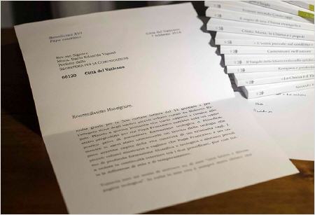 Le Saint-Siège n'a pas encore publié le texte intégral de la lettre que le Pape émérite Benoît XVI a adressée à Mgr Dario Vigano, préfet du Secrétariat aux Communications, à propos de 11 fascicules sur la Théologie du Pape François, mais elle vient d'être publiée cet après-midi par Sandro Magister sur son blog Settimo Cielo.