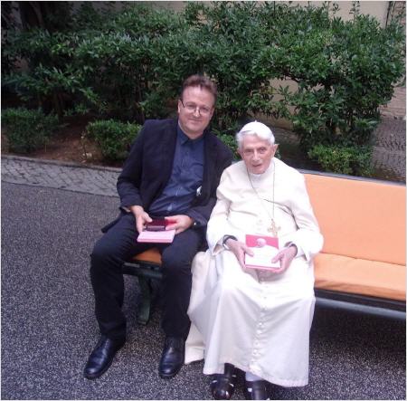 Benoît XVI avec Stefan Högl, qui lui a présenté le 1er septembre dernier son livre "Fels in der Brandung in stürmischen Zeiten", consacré à ce que l'auteur définit comme "l'agenda philosophique" du Pape émérite (La Vigna del Signore).