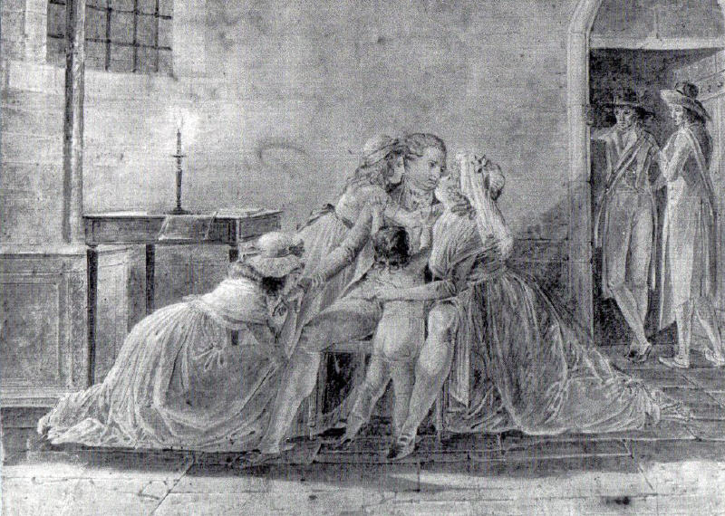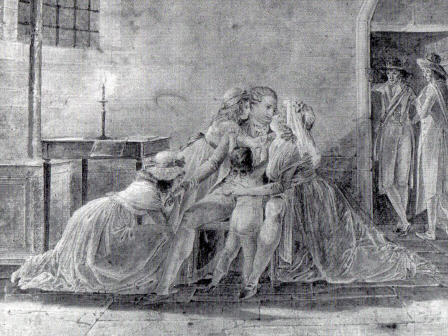 >>> Ci-dessous: Adieux du Roi à sa famille, représentés d'après nature le soir du 20 janvier par un témoin oculaire, JB Mallet, l'un des commissaires de la Commune qui se relayaient à la prison du Temple pour garder le Roi. Bien loin des gravures sulpiciennes datant de la Restauration, et le représentant conformément au portrait peu flatteur qu'on faisait généralement de lui. Illustration du très beau livre de Paul et Pierrette Girault de Coursac "Louis XVI, un visage retrouvé: portrait physique et moral du denier Roi très Chrétien", ed. O.E.I.L., Paris, 1990.