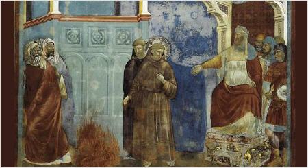 On y voit saint François inviter les chefs musulmans présents à la cour du sultan à entrer avec lui dans le feu - mais eux s'enfuient -, pour montrer que le Christ est le vrai Dieu, tandis que le dieu islamique est une imposture.