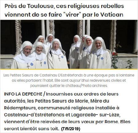 Evidemment, les médias laïcs relaient cela selon un point de vue essentiellement profane (qui n'est pas forcément hors-sujet ici) , avec en arrière-plan « un différend avec Mgr Scherrer [archevêque de Laval] sur fond de gestion de maisons de retraite»... et d'appétits immobiliers de l'archevêché. Est toutefois également évoqué le reproche que les soeurs adressent à Rome «de vouloir leur faire changer de manière de vivre [leur] vie religieuse, à l’instar [à l'opposé? ndlr] des orientations actuelles…». Selon La Dépêche, «elles ne cachent pas leur attachement à un certain traditionalisme (elles portent la guimpe, la pièce de toile qui couvre la tête et encadre le visage des religieuses) qui ne semblerait plus correspondre à une Église tentée par la modernité».