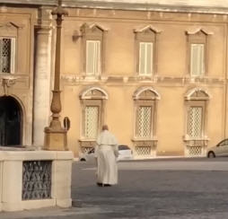 On le voit marcher seul et personne ne le remarque, ou plutôt, d'après la voix en arrière-plan, on peut voir que les gens présents là ont été priés de ne pas approcher le pape et de le laisser partir seul.... une voix dit "il est à bout" [è sfinito] (et rit); une autre voix répond: "Ils m'ont dit de ne rien dire..." [mi hanno detto di dire niente].