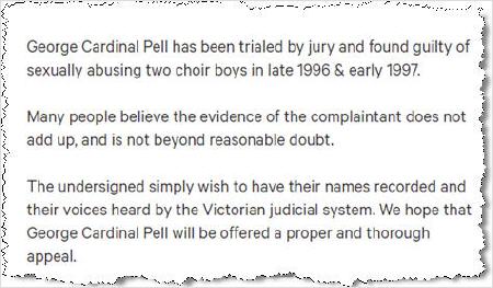 Les soussignés souhaitent simplement que leur nom soit enregistré et que leur voix soit entendue par le système judiciaire de l'Etat du Victoria. Nous espérons que le cardinal George Pell se verra offrir un appel correct et approfondi.
