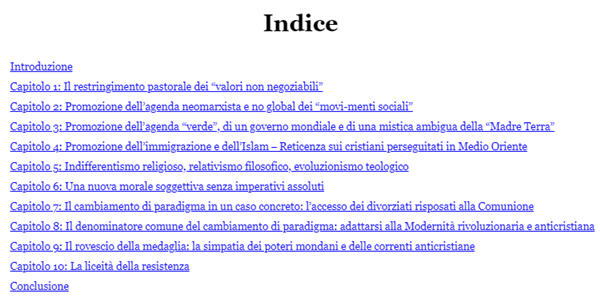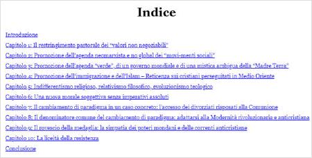 Avant la conclusion, dans laquelle l'auteur parle explicitement de «confusion» dans l'Église et va jusqu'à envisager une possible «scission pratique» comme conséquence de l'actuelle «division virtuelle» entre deux courants clairement opposés, Ureta se demande s'il y a une «licéité de la résistance» à un Magistère qui, à bien des égards, n'apparaît plus catholique, et la réponse, compte tenu de l'argumentation qui précéde, est évidemment que la résistance n'est pas seulement possible, mais juste.