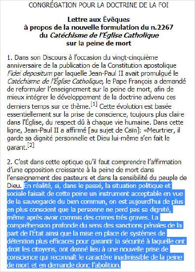 Toutefois, il y a aussi l'autre question, celle de la motivation utilisée par François pour exprimer l'inadmissibilité de la peine de mort. En effet, pour justifier sa décision, le pape ne s'est pas inspiré du patrimoine de foi et de doctrine conservé et transmis par l'Église, mais il a considéré ce qui se passait dans le monde. Il a écrit qu'il y a trois conditions préalables au changement: la «conscience toujours plus vive» de la dignité de la personne, la «nouvelle compréhension de la signification des sanctions pénales par l'État« et, enfin, les nouveaux «systèmes de détention plus efficaces». Comme on le voit, rien qui concerne l'Écriture, l'enseignement de l'Église et le Magistère.