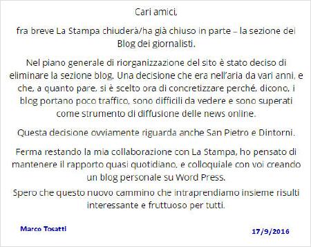 En 2016, un plan de restructuration de la partie numérique du journal a décrété la disparition de la plupart des blogs, et bien sûr, avec eux, de <San Pietro e dintorni>, après quelques épisodes de censure peu reluisants, par les autorités du journal (*).