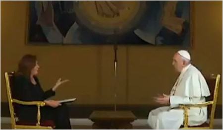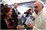 Valentina Alazraki peut à l'évidence se vanter (si j'en crois les photos trouvées sur internet) d'une certaine familiarité avec le Pape, dont elle suit tous les voyages depuis le début du pontificat, et qu'elle a déjà interviewé: c'est de cette familiarié (non dénuée, apparemment, de sympathie) qu'elle se prévaut pour poser des questions-choc, parfois à la limite de l'impertinence, et il faut reconnaître qu'elle fait bien son job de journaliste: elle ne lâche rien, elle ne démontre aucune complaisance envers lui, et on sent bien qu'il ne la convainc pas.