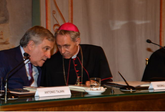 >>> Ci-contre: Georg Gänswein et le président du parlement européen Antonio Tajani (un proche de Silvio Berlusconi), qui participait à l'évènement.