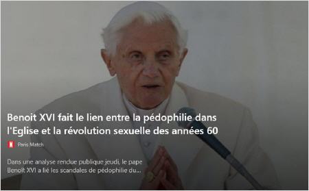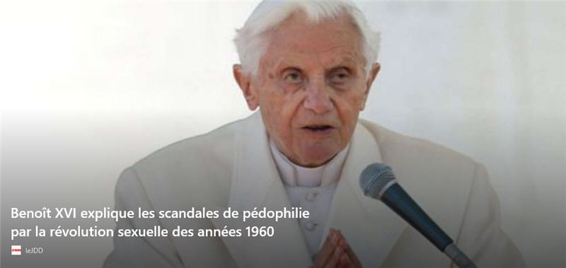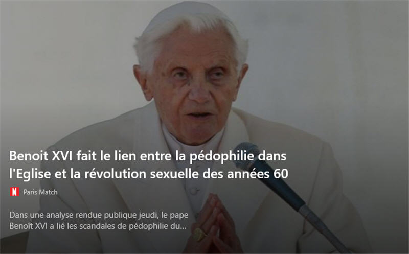 Dans 18 pages de surprenantes réflexions [!!!] publiées dans Klerusblatt, un mensuel bavarois destiné au clergé, le pape démissionnaire voici six ans souligne que « la révolution de 1968 s’est battue pour une complète liberté sexuelle, qui n’admettait plus de normes » et que la pédophilie a alors été « diagnostiquée comme permise et appropriée » par certains. Il met également en avant des idées théologiques nouvelles et l’effondrement de la foi en Occident pour expliquer les énormes scandales liés aux prêtres pédophiles.