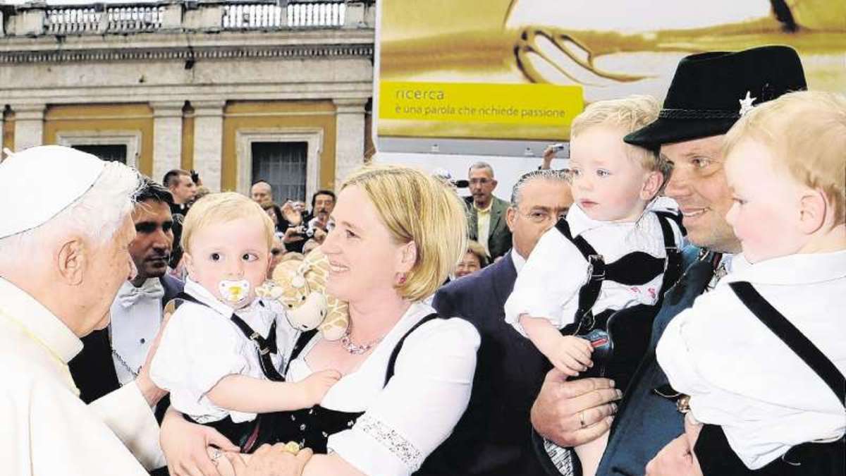 En 2010, Evelyn et Martin Schmid étaient de nouveau à Rome pour une audience, cette fois avec leurs triplés, et de nouveau au premier rang, tout en haut [de la Place Saint-Pierre], où seuls les invités sont autorisés à prendre place. Lors de sa tournée [en papamobile], quand le Pontife arriva près de la famille Schmid il reconnut les parents et s'enthousiasma pour les triplés. Comme il sied à une famille bavaroise, ils étaient tous en costume traditionnel, les trois garçons vêtus des culottes de cuir courtes (photo ICI). Le Pape Benoît XVI prit le temps d'une conversation très personnelle avec les Ruhpoldingers, et pour finir, il bénit les triplés, donnant à chacun un chapelet. La présence de la famille enchanta tellement la presse du Vatican que même "L'Osservatore Romano" leur consacra un grand article.