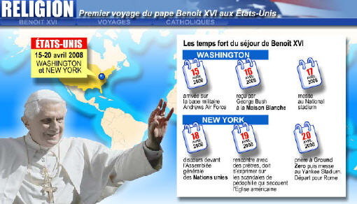 C'est ce mardi que commence la visite du pape Benoit XVI aux Etats-Unis, visite qui se prolongera jusqu'au dimanche 20 avril. Lors de cette visite, le pape devrait rencontrer, hormis le prédisent qui l'accueillera à son arrivée, la conférence des évêques catholiques des Etats-Unis, le monde universitaire catholique, mais aussi les représentants d'autres religions (juives, protestantes, musulmanes, hindouistes...). Les deux évènement majeurs de son voyage seront sans aucun doute son discours à l'ONU et la prière qu'il fera au "ground zéro", à l'endroit même où se son effondrées les tours du world trade center. Il dira une messe au "Yankee Stadium", stade de plus de 55000 places avant de s'en retourner à Rome.