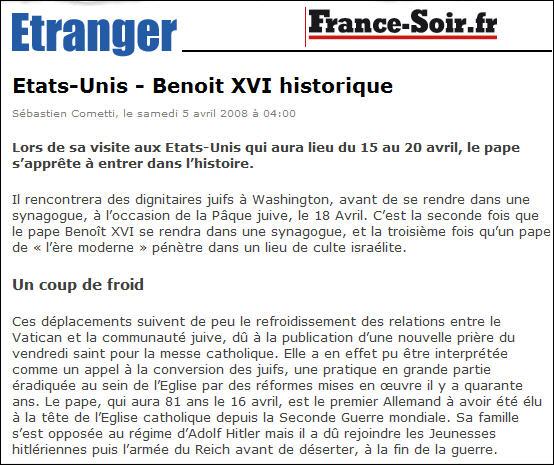 Précédés d'un titre qui incite à la réflexion, à cinq mois de la visite de Benoît XVI en France: On Eve of Visit, Pope Benedict Still Unknown to Many Americans (à la veille de la visite, le pape Benoît est encore inconnu pour beaucoup d'américains)