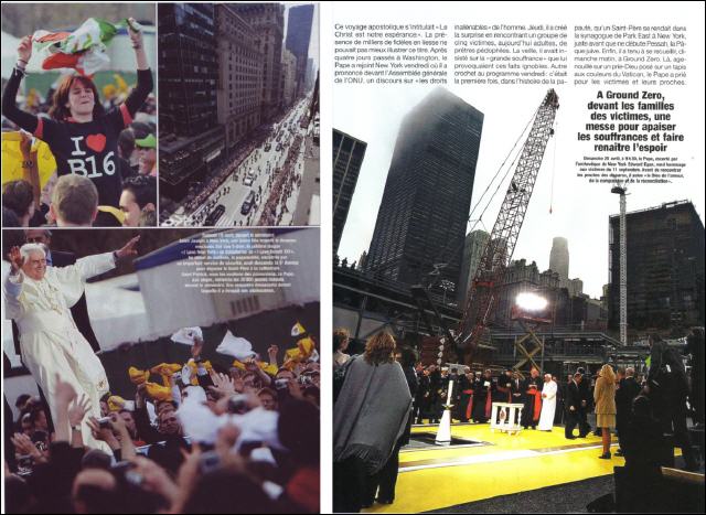 On peut savoir gré à Paris-Match de couvrir l'évènement en quatre pleines pages, et d'avoir présenté de belles images. Mais on peut aussi s'étonner du manque de professionalisme, pour un journal aussi diffusé: le calembour du titre (Pope Star) n'est pas du meilleur goût... et la prière à Ground Zero est devenue une messe!! C'est presque le bonnet d'âne de l'incompétence, ex-aequo avec le site de l'Express.fr (La longue tunique blanche du pape ).
