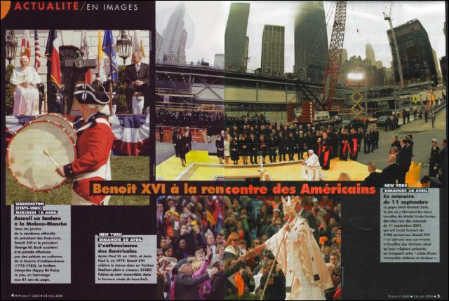 Le Pape redonne le moral aux catholiques américains ------------------------ Durant son voyage aux Etats-Unis, du 15 au 20 avril, Benoît XVI a contribué à restaurer, dans l'opinion américaine comme chez les catholiques, l'image d'une Eglise écornée par les récents scandales. C'est une Eglise américaine dynamique et en pleine croissance - 70 millions de fidèles, soit un quart de la population des Etats-Unis -, mais aussi meurtrie par le récent scandale des prêtres pédophiles, que Benoît XVI s'est employé à réconforter. A bien des égards, il y a réussi. Le succès médiatique a été indéniable. Mal connu d'une société américaine pluri-religieuse à majorité protestante, Benoît XVI a partagé, durant sa visite, les « unes » des grands quotidiens avec les candidats à l'élection présidentielle. « Cet homme, qui a si longtemps vécu loin des projecteurs, est acclamé comme une rock star », commentent les correspondants religieux du New York Times. Sur place au même moment, le P. Patrick Desbois, responsable des relations judéo-chrétiennes pour l'épiscopat français, raconte : « Il régnait une grande excitation dans les rues de NewYork et de Washington. Partout, on voyait des affiches et des posters de Benoît XVI. » Plusieurs temps forts ont marqué cette visite: l'accueil, à Washington, des représentants américains des grandes religions; le recueillement à Ground Zero, à New York; ou la rencontre, dans une synagogue new-yorkaise, avec le rabbin Arthur Schneier, un Autrichien rescapé de la Shoah.