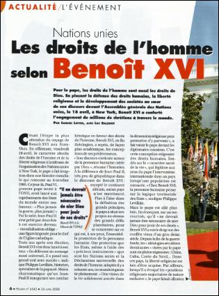 En plaçant la défense des droits humains, la liberté religieuse et le développement des sociétés au cœur de son discours devant l'Assemblée générale des Nations unies, le 18 avril, à New York, Benoît XVI a conforté l'engagement de millions de chrétiens à travers le monde.