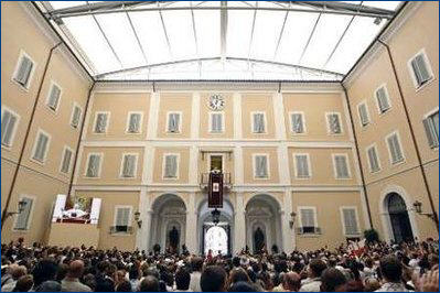 Premier angelus de vacances dans la petite cité castellane. Accueil chaleureux (ou plus) de la foule, dans l'atmosphère familiale de la cour du palais apostolique. Quelques thèmes chers au Magistère. Et quelques photos. (11/7/2010)