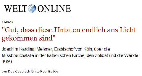 Joachim Kardinal Meisner : En janvier j’étais encore loin d’imaginer que tout cela pourrait seulement exister. Mais il me fallait me rendre à l’évidence ; c’est la dure réalité aussi chez nos prêtres en Allemagne. Et cela a provoqué en moi un choc terrible. Mais après tout, j’ai été fortifié dans ma conviction qui est la suivante : là où il s’agit de la sanctification des prêtres, le diable, le diviseur, l’ennemi, essaie de contre-carrer le règne de Dieu, mais finalement le règne de Dieu triomphe même sur le mal. A ce point de vue-là, on peut considérer comme un bien que tous ces méfaits soient venus au grand jour.