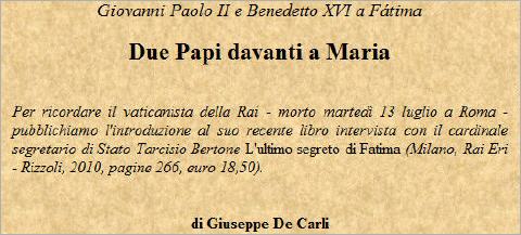 La mort brutale de Giuseppe de Carli est l'occasion, pour L'Osservatore Romano du 15 juillet, de publier sa préface à son dernier livre, paru cette année aux éditions Rizzoli "L'ultimo segreto di Fatima" (1). Il s'agit d'un livre d'entretiens avec le cardinal Bertone, faisant suite à une autre interviewe du même Bertone, publiée il y a deux ans, "L'Ultima vegente di Fatima", sous titré "I miei colloqui con Suor Lucia", et traduit en français aux éditions Bayard sous le titre "La dernière voyante de Fatima" (2)