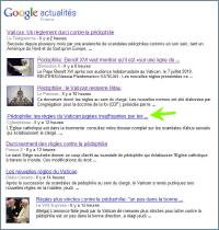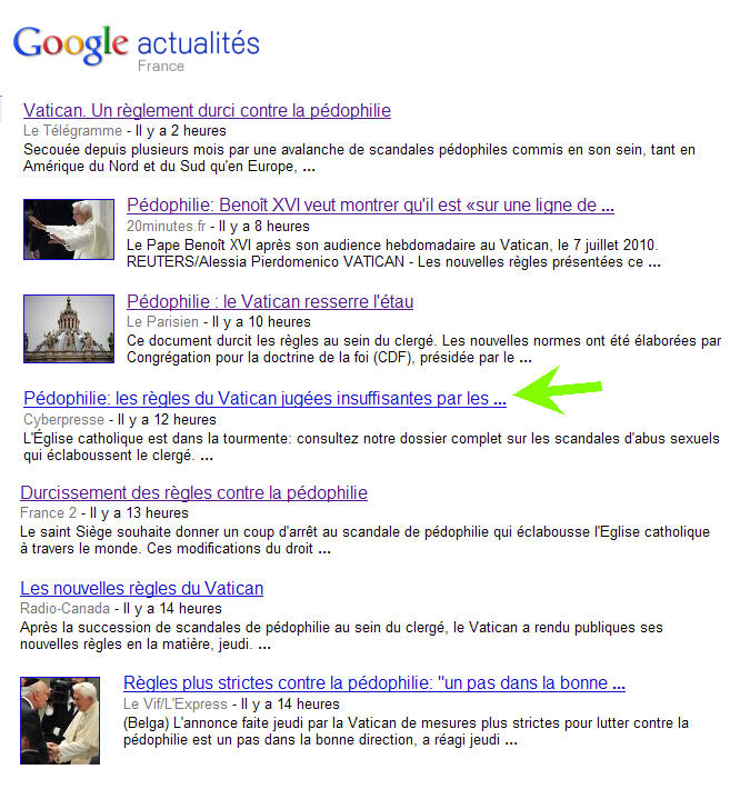 A ce sujet, observer l'avalanche de dépêches, sur la page d'acualités de Google (cliquez ci-contre) est un exercice tristement édifiant: elles titrent toutes à peu près pareil (Vatican. Un règlement durci contre la pédophilie, ou bien Pédophilie: le Vatican resserre l'étau), et émanent de sites qui ne parlent jamais de l'Eglise sinon pour l'éreinter. Ils ont été cette fois d'une réactivité qui laisse songeur... suscitant de la part des habituels internautes abrutis qui n'ont généralement lu que le titre et ne connaissent rien aux faits les réactions que l'on imagine. Quand on pense à la couverture médiatique "grand public" qu'a reçu en juin 2009 l'immense et fondamental document que constituait l'Encyclique Caritas in Veritate (c'est-à-dire un black-out presque total), il y a de quoi être suffoqué d'indignation.