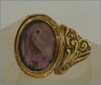 C'est une améthyste ovale, enchassée dans un anneau d'or. L'améthyste est gravée avec l'image d'un pélican, le symbole de la crucifixion, parce qu'on dit que le pélican nourrit ses jeunes avec son propres sang, en se déchirant la poitrine. la bague est un peu usée, comme on peut s'y attendre après avoir été portée continuellement pendant trente ans. Elle est aussi extrêmement émouvante, et c'est probablement l'objet le plus précieux que Joseph Ratzinger a confié pour l'exposition.