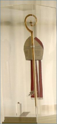 Pour moi, la pièce majeure est dans un présentoir contenant les symboles de la charge de Joseph Ratzinger comme évêque de Munich et Freising. Il y a l'une de ses mitres, sa crosse, et une autre croix pectorale, plus lourde, en argent. La mitre est brodée avec les armoiries du Cardinal Archevêque de Munich et Freising. La crosse, une élégante canne recourbée, ciselée, ornée d'une améthyste en son centre, est un cadeau de son frère Georg.