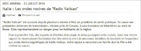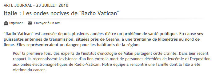 Lu récemment sur internet: "Un rapport de justice épingle la dangerosité des antennes de la radio du Saint-Siège" (1). C'était juste après la campagne d'intoxication sur les "prêtres pédophiles"... Vittorio Messori dénonce la énième instrumentalisation contre l'Eglise avec des arguments qu'on ne peut écarter (29/7/2010)
