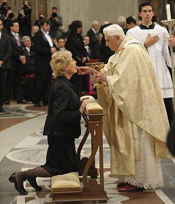 Parmi les "nouveautés" liturgiques introduites - à petites touches - par Benoît XVI, le Père Scalese citait la communion distribuée sur la langue aux fidèles agenouillés. (cf. La réforme de la réforme )