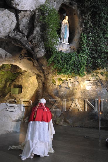Sa prière intense a rappelé celle de Jean-Paul II en ce même lieu, le 14 août 2004. Benoît XVI avait auparavant effectué les deux premières étapes du chemin jubilaire, au baptistère de l’église paroissiale et à l’ancienne prison désaffectée où logeait la famille de Bernadette lors des apparitions. Le climat de prière et d’intériorité s’est imposé d’emblée dans les Sanctuaires de Lourdes. Le soir, la procession aux flambeaux s’est conclue par un long échange silencieux de regards entre la multitude et Benoît XVI, dans la paix d’une prière profonde et vraie.