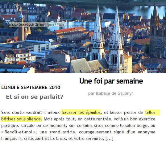 La "polémique" évoquée ce matin s'impose en quelque sorte à moi, et j'espère bien jouer un rôle positif en ouvrant - très volontiers et comme il est juste - mon site à François H. qui répond (très courtoisement, mais très franchement) à Isabelle de Gaulmyn.