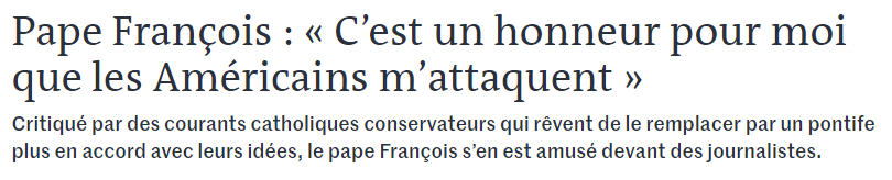 Dans l’avion qui l’emmenait pour son énième voyage en Afrique, François s’est vu remettre par l’envoyé spécial de la Croix un exemplaire de son dernier livre, « Comment l’Amérique veut changer de Pape ». « C’est un honneur pour moi que les américains m’attaquent », a cru bon d’ironiser le Pape. Un provocation qui a suscité une mise au point embarrassée du directeur de la salle de presse. A suivre….
