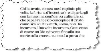 Scalfari écrit à propos du pape : « Ceux qui ont eu, comme je l’ai eu plusieurs fois, la chance de rencontrer [François] et de lui parler avec la plus grande confiance culturelle, savent que le Pape François conçoit le Christ comme Jésus de Nazareth, homme et non Dieu incarné. Une fois incarné, Jésus cesse d’être un Dieu et devient un homme jusqu’à sa mort sur la croix« .