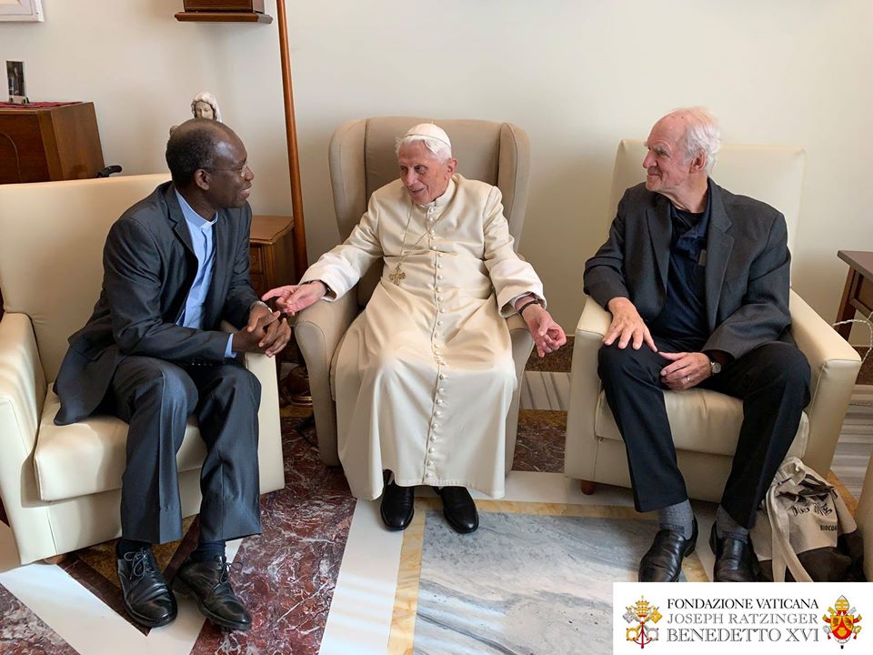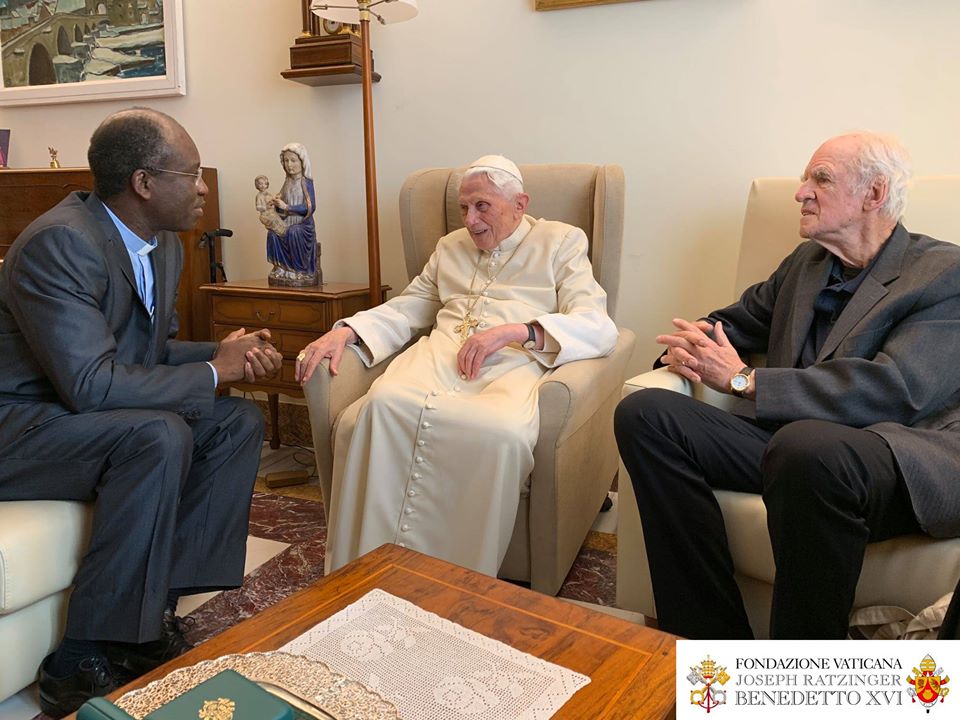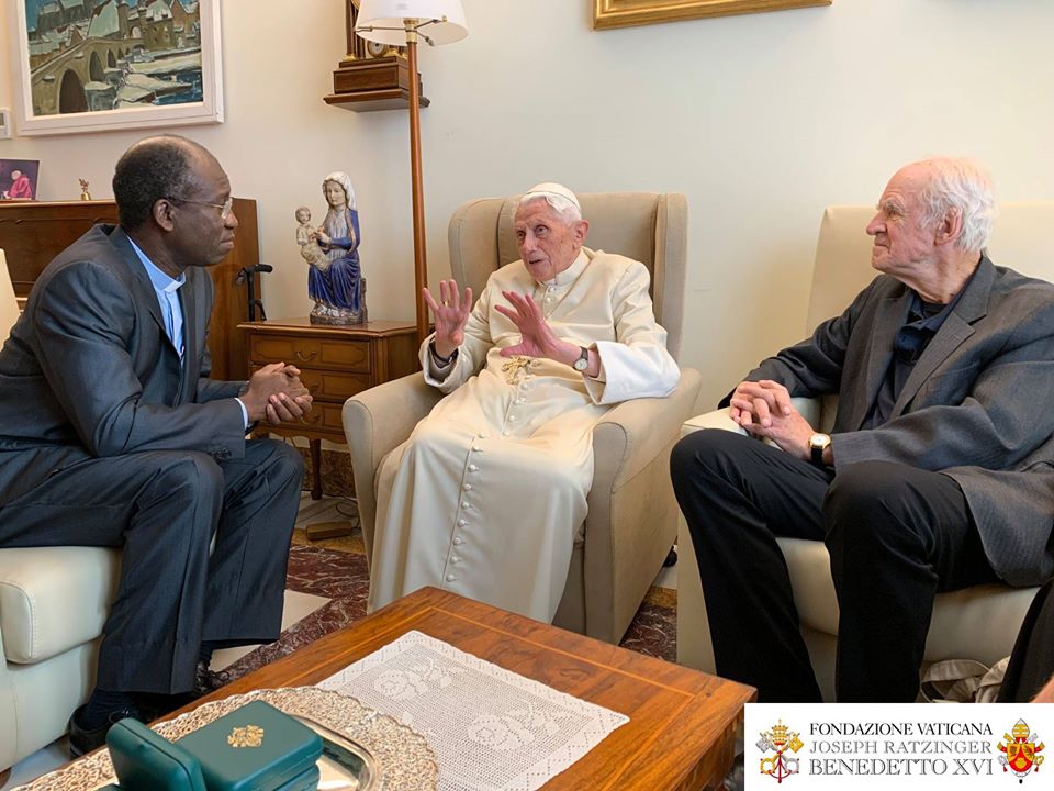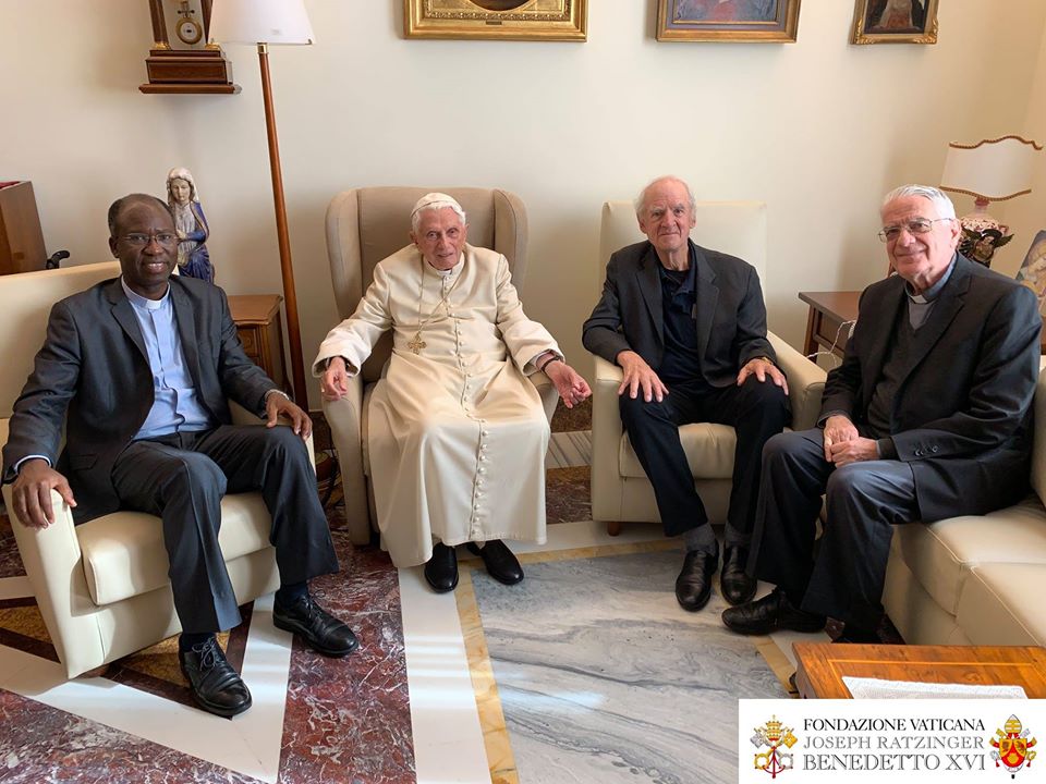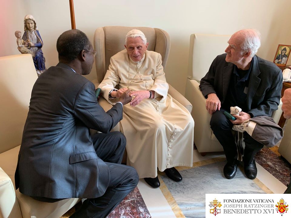 Le Pape émérite a reçu le 10 novembre, à Mater Ecclesiae, le Canadien Charles Taylor et le burkinabé Paul Béré accompagnés du P. Lombardi. Photos de la Fondation Vaticane Joseph Ratzinger/Benoît XVI .
