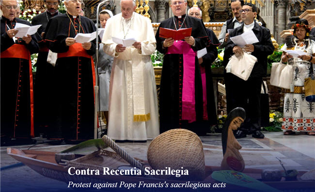 Au cours du récent Synode, avec la célébration inaugurale dans les Jardins du Vatican et l’apparition de la pachamama à Saint-Pierre et Santa Maria in Traspontina, un acte sacrilège grave a été consommé. Le culte du Dieu vivant et vrai, révélé et manifesté en Jésus-Christ, que l’Église catholique adore et professe, a été contaminée par des éléments clairement idolâtres et syncrétistes.