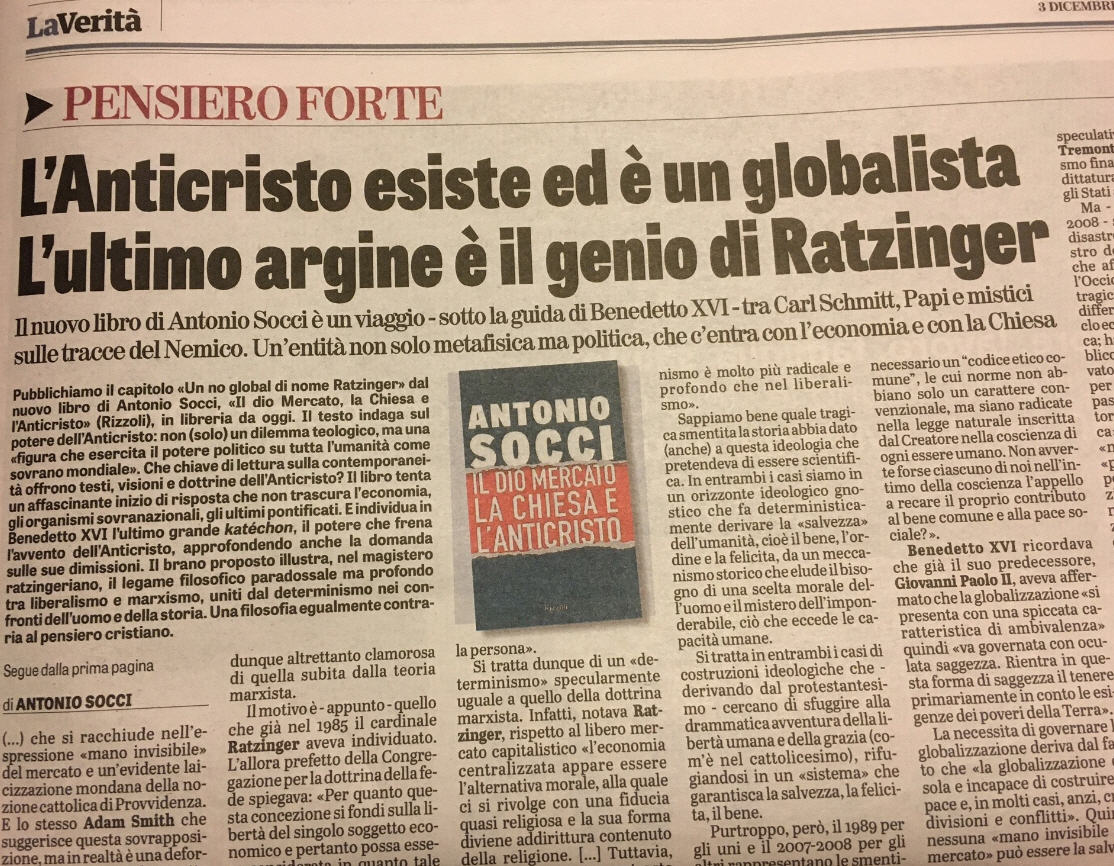 Nous publions le chapitre « Un no global di nome Ratzinger » du nouveau livre d’Antonio Socci, « Il dio Mercato, la Chiesa e l’Anticristo » (Rizzoli), en librairie dès aujourd’hui. Le texte enquête sur le pouvoir de l’Antichrist : pas (seulement) un dilemme théologique, mais une « figure qui exerce le pouvoir politique sur toute l’humanité comme souverain mondial ». Quelle clé de lecture sur l’époque contemporaine offrent les textes, les visions et les doctrines de l’Antéchrist? Le livre tente un début de réponse fascinant qui ne néglige pas l’économie, les organes supranationaux, les derniers pontificats. Et il identifie dans Benoît XVI le dernier grand katéchon, le pouvoir qui retarde l’avènement de l’Antichrist, approfondissant aussi la question de sa démission.
