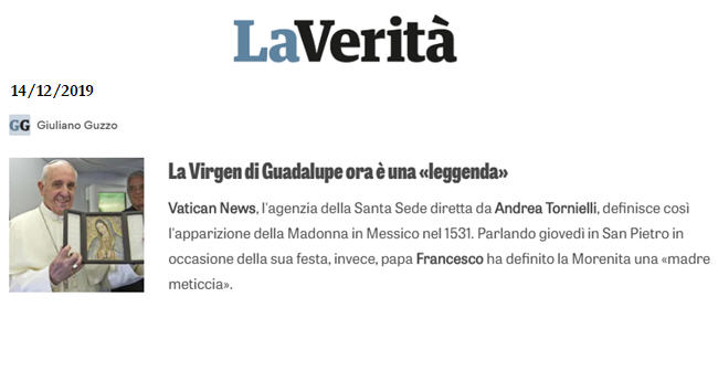 Comme si cela ne suffisait pas, l’article est rendu encore plus troublant par les mots – certainement authentiques, et pas du tout « légendaires » – du Pape François qui, jeudi, réfléchissant sur la fête de la Bienheureuse Vierge Marie de Guadalupe, dans une intervention a braccio et en espagnol a défini la sainte patronne du continent sud américain « senora-mujer, madre y mestiza« , autrement dit femme, mère et métisse.
