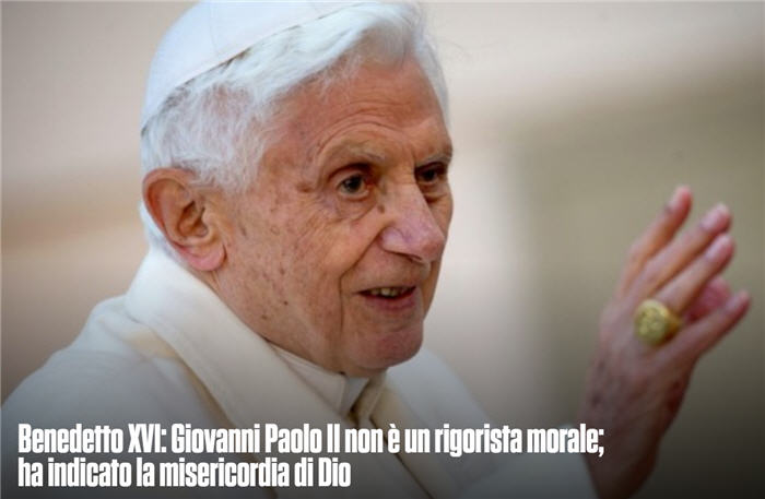 La miséricorde de Dieu finira par s’avérer plus forte que notre faiblesse. Nous devons y trouver l’unité intérieure du message de Jean-Paul II et les intentions fondamentales du pape François : contrairement à ce qui est parfois dit, Jean-Paul II n’est pas un rigoriste moral. Tout au long de sa vie, il a montré l’importance de la miséricorde », souligne le pape Benoît XVI dans son message à l’occasion du centenaire de la naissance de Saint Jean-Paul II.