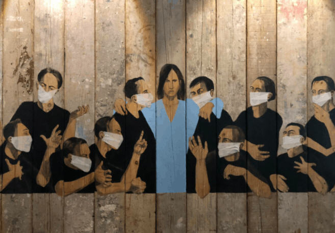 Son univers, tout à la fois inspiré de la bande dessinée et des vitraux, nous rend le Christ tout proche. Ces disciples qui l’entourent, ce sont nous. En les affublant d’un masque, dans un geste qui mutile volontairement l’une de ses œuvres, l’artiste pointe au moins trois dissonances fondamentales entre le message chrétien et l’injonction à généraliser le masque et la distanciation sociale.