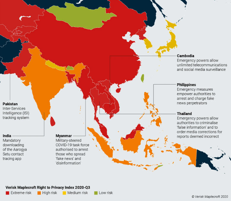 Selon les analystes de Verisk Maplecroft, les menaces sur la vie privée de la population asiatique vont se multiplier dans les années à venir. Pour renverser la tendance, les gouvernements de la région devraient prendre des mesures transparentes dans la gestion des données personnelles, en particulier celles utilisées pour contrer l’urgence Covid-19.