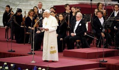Dans la salle Paul VI, en mai 2011, toujours avec les musiciens de l’Opéra de Rome, a résonné le Credo en sol majeur de Vivaldi. « Un morceau – rappelle Benoît XVI – probablement composée en 1715 sur lequel je voudrais faire trois remarques. Tout d’abord un fait anormal dans la production vocale de Vivaldi: l’absence de solistes, il y a seulement le chœur. De cette façon, Vivaldi veut exprimer le ‘nous’ de la foi. Le ‘Credo’ est le ‘nous’ de l’Église qui chante, dans l’espace et dans le temps, en tant que communauté de croyants, sa foi; ‘mon’ affirmation du ‘credo’ est insérée dans le ‘nous’ de la communauté. Je voudrais ensuite signaler les deux splendides tableaux centraux: Et incarnatus est et Crucifixus. Vivaldi s’attarde, comme c’était l’usage, sur le moment où le Dieu qui semblait lointain devient proche, s’incarne et se donne sur la Croix. Ici, la répétition des mots, les modulations continues rendent le profond sentiment d’étonnement devant ce Mystère et nous invitent à la méditation, à la prière. Une dernière observation. Carlo Goldoni, grand représentant du théâtre vénitien, notait lors de sa première rencontre avec Vivaldi: ‘Je l’ai trouvé entouré de musique et le bréviaire à la main’. Vivaldi était prêtre et sa musique est née de sa foi ».