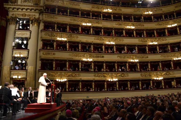 Ce n’est pas tout. En 2008, le Pape Ratzinger rappelle l’importance de l’éducation au Beau. « Je pense surtout aux jeunes générations qui, en s’approchant de ce patrimoine artistique, peuvent y puiser une inspiration toujours nouvelle pour construire le monde selon des projets de justice et de solidarité, valorisant, au service de l’homme, les expressions multiformes de la culture mondiale. Je pense aussi à l’importance de l’éducation à la beauté authentique pour la formation des jeunes. L’art dans son ensemble contribue à affiner leur âme et les oriente vers la construction d’une société ouverte aux idéaux de l’esprit », a-t-il dit en 2007 après un concert de Verdi dans l‘Aula Paolo VI.