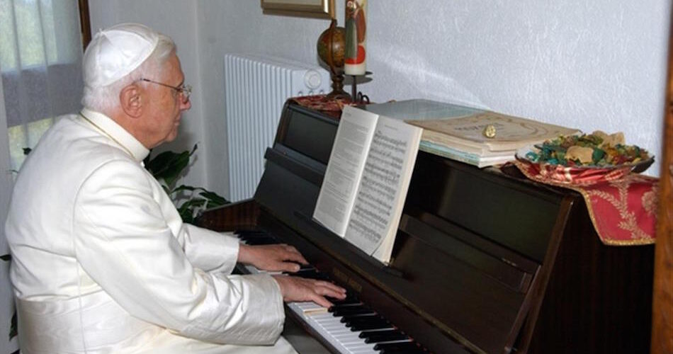 La musique est une passion que Joseph Ratzinger a toujours cultivée, même après son élection comme successeur de Pierre. Jouant du piano, naturellement. Écoutant des concerts – nombreux sont ceux qui ont été proposés au Vatican pendant le pontificat de Benoît XVI. Et en parlant de musique, en musicien qui sait combiner les notes avec la foi, qui sait faire dialoguer l’art avec l’étincelle du Créateur. « La musique nous purifie et nous élève, elle nous fait sentir la grandeur et la beauté de Dieu » : telle est la réflexion faite en octobre 2005 par Joseph Ratzinger, après un concert du Münchner philharmoniker dirigé par Christian Thielemann, souhaitant que « l’harmonie du chant et de la musique, qui ne connaît pas de barrières sociales ou religieuses, puisse représenter une invitation constante pour les croyants et pour tous les hommes de bonne volonté à chercher ensemble le langage universel de l’amour qui rend les hommes capables de construire un monde de justice et de solidarité, d’espérance et de paix ».
