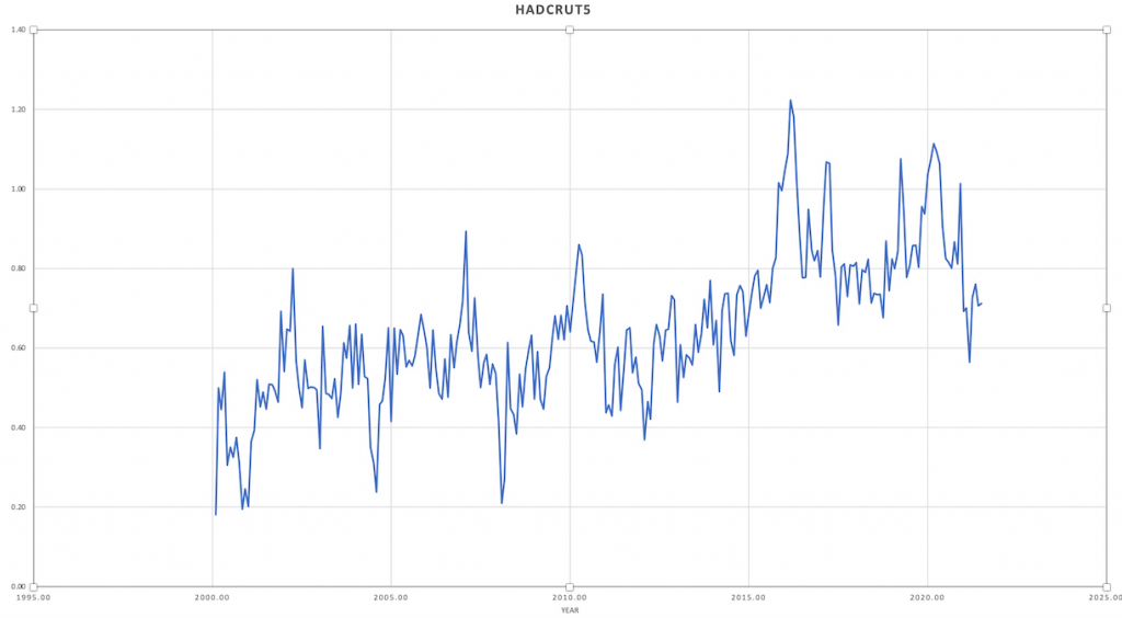 Pour en revenir au sixième rapport d’évaluation présenté hier, il y a un petit détail qu’il laisse de côté, à savoir qu’il n’y a pas de hausse linéaire ou tumultueuse des températures mondiales (bien que les émissions de CO2 aient augmenté), et même, nous sommes aujourd’hui exactement au niveau où nous étions au moment du dernier rapport du GIEC (2014), comme le montre ce graphique de la base de données Hadcrut5 du MetOffice britannique [l’équivalent de Météo France, ndt].