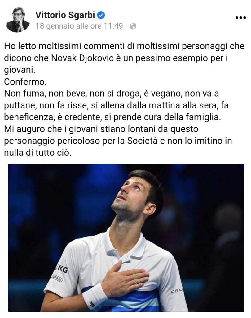 L’Australie a donc expulsé le joueur de tennis car il serait un modèle négatif pour ses jeunes. En punir un pour en éduquer cent, mille ou cent mille. À cet égard, je voudrais citer la réponse de l’honorable Vittorio Sgarbi, qui, avec son aplomb habituel, désigne Djokovic comme un véritable modèle à imiter pour la jeunesse d’aujourd’hui: