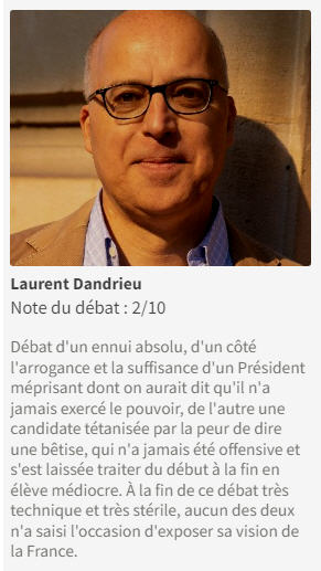 Emmanuel Macron et Marine Le Pen ont défendu leurs projets, mais la confrontation a été d’un ennui total, un débat très technique et stérile dans lequel aucun des deux n’a saisi l’occasion d’exposer sa vision de l’avenir de la France. Pour le journal en ligne Boulevard Voltaire, il s’est agi d’un débat entre un robot (Macron) et une femme timorée (Le Pen), « une machine acérée, méprisante, technoïde et froide, une machine qui s’appelle Emmanuel Macron », qui regarde vers l’avenir écologique du pays et une femme qui estime que le peuple veut « un retour à la tranquillité et au bon sens dans la gestion des affaires de l’État ». Certes, si Marine Le Pen avait été une femme de gauche, toute la presse aurait traité Macron de paternaliste et dénoncé son attitude discriminante.