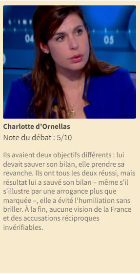 Parmi les rédacteurs de l’autre journal conservateur français, Valeurs Actuelles, Charlotte d’Ornellas écrit que les deux candidats « avaient deux objectifs différents : lui devait sauver son bilan, elle devait prendre sa revanche. Ils ont réussi tous les deux, mais le résultat est que lui a sauvé son bilan – même s’il a été plus qu’arrogant – et elle a évité l’humiliation sans briller. Au final, aucune vision de la France et des accusations mutuelles invérifiables. »