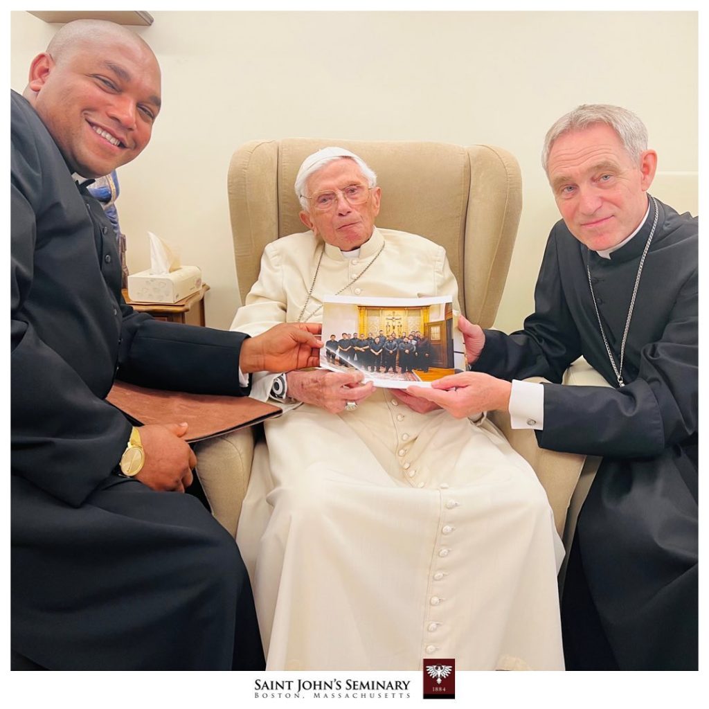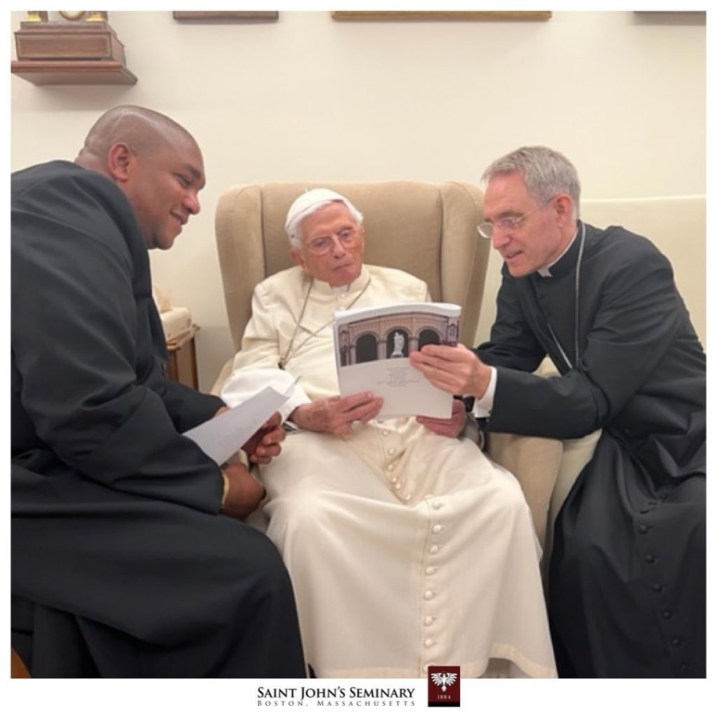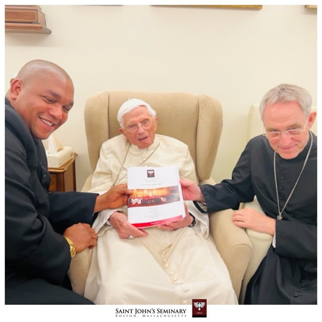 (…) Ensuite, que devais-je dire à Benoît ? Je me suis soudain rendu compte qu’il avait été plus facile d’écrire sur Benoît que de lui parler directement. Une fois encore, je me suis tournée vers le Père Connors pour obtenir de l’aide. Et il m’a aidé à rassembler mes idées. Je partage donc avec vous une partie de ce que j’ai dit à Benoît. Et aussi, quelques photos de notre catalogue du séminaire pour 2022/2023, et un cadeau de la classe du cours optionnel Ratzinger (une photo), que la classe m’a demandé de donner à Benoît. Il était très heureux que tant de jeunes séminaristes suivent ce cours.