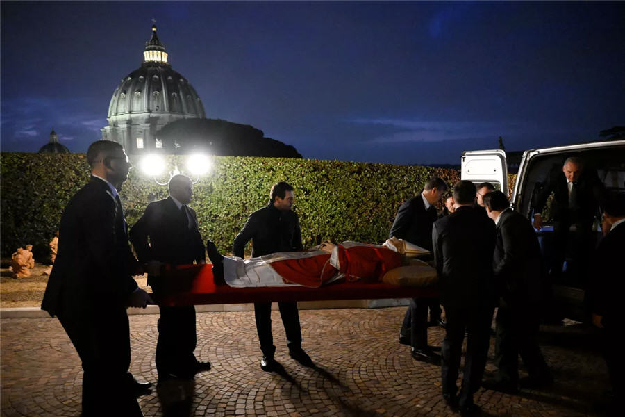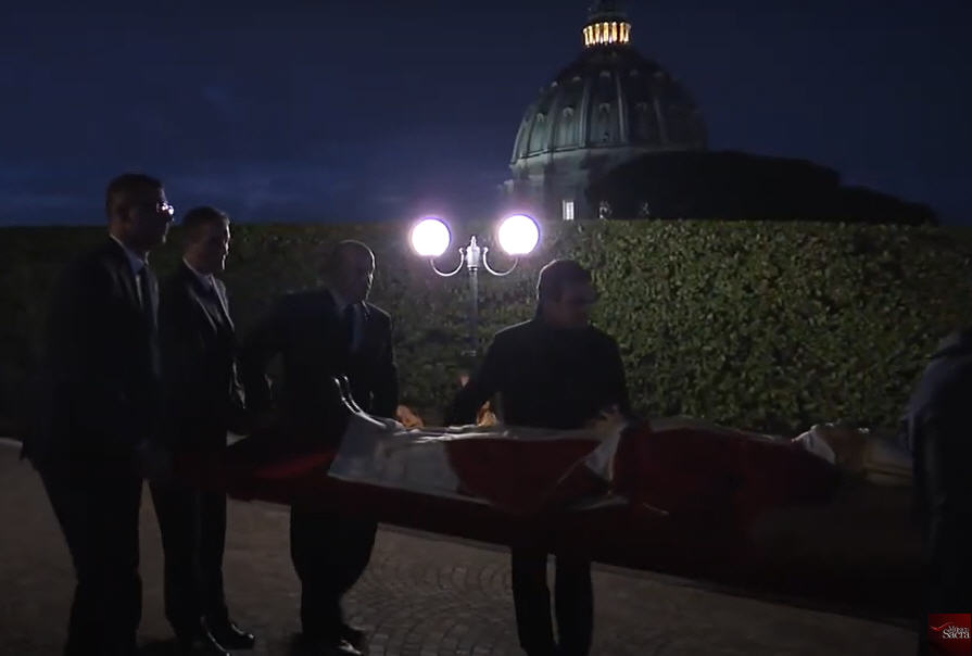 Mise à jour (autres images) – A 7 heures, dans l’aube froide et sombre d’un matin d’hiver romain, il a quitté sa chapelle privée de Mater Ecclesiae entouré de sa « famille » pour rejoindre la Basilique, où il a été accueilli par l’archiprêtre le cardinal Gambetti. Image symétrique de celle de son entrée triomphale dans la même Basilique le 24 avril 2005, au son de la litanie des Saints (ora pro nobis). Ce qui frappe, c’est l’extrême simplicité du convoi funèbre, loin des fastes qu’une certaine vulgate associe au Vatican, et la fourgonnette de pompes funèbres qui transporte son corps n’est pas un somptueux corbillard mais guère plus qu’une camionnette utilitaire. Les images de la levée du corps dans la chapelle de sa maison sont très émouvantes, on perçoit la tendresse des memores qui lui caressent furtivement une dernière fois la main. On retrouve un peu de la pompe romaine dans la Basilique, le bref rituel, rythmé par la litanie des saints funèbre (ora pro eo) et les chants d’un chœur d’hommes, est empreint d’une noble simplicité qui souligne la gravité mais en même temps, de façon surprenante, la sérénité du moment.