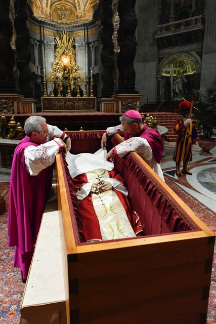 Puis, après avoir transporté le cercueil dans les grottes, le cardinal Re, revêtu du pivial, a récité la dernière prière de concession funèbre [?] ; le premier cercueil a été scellé.